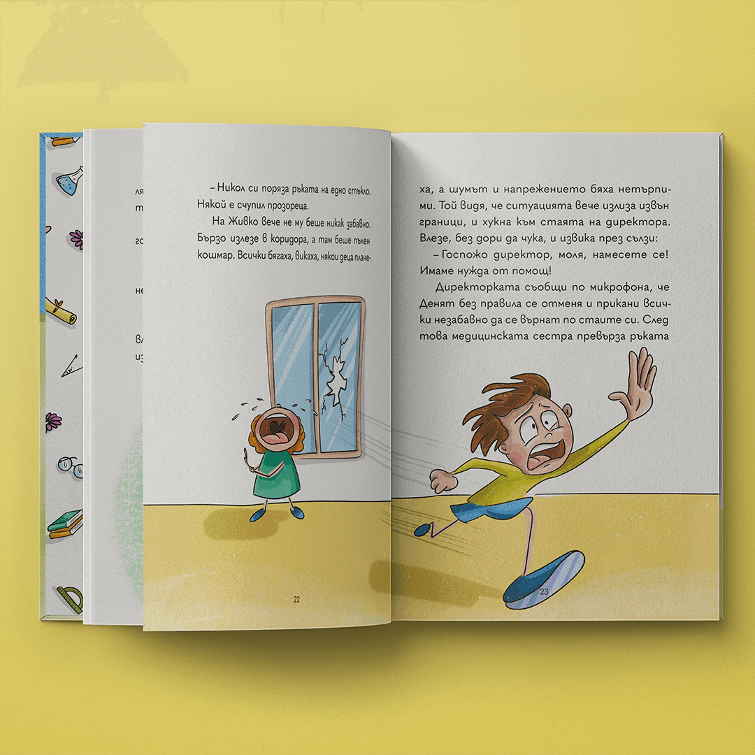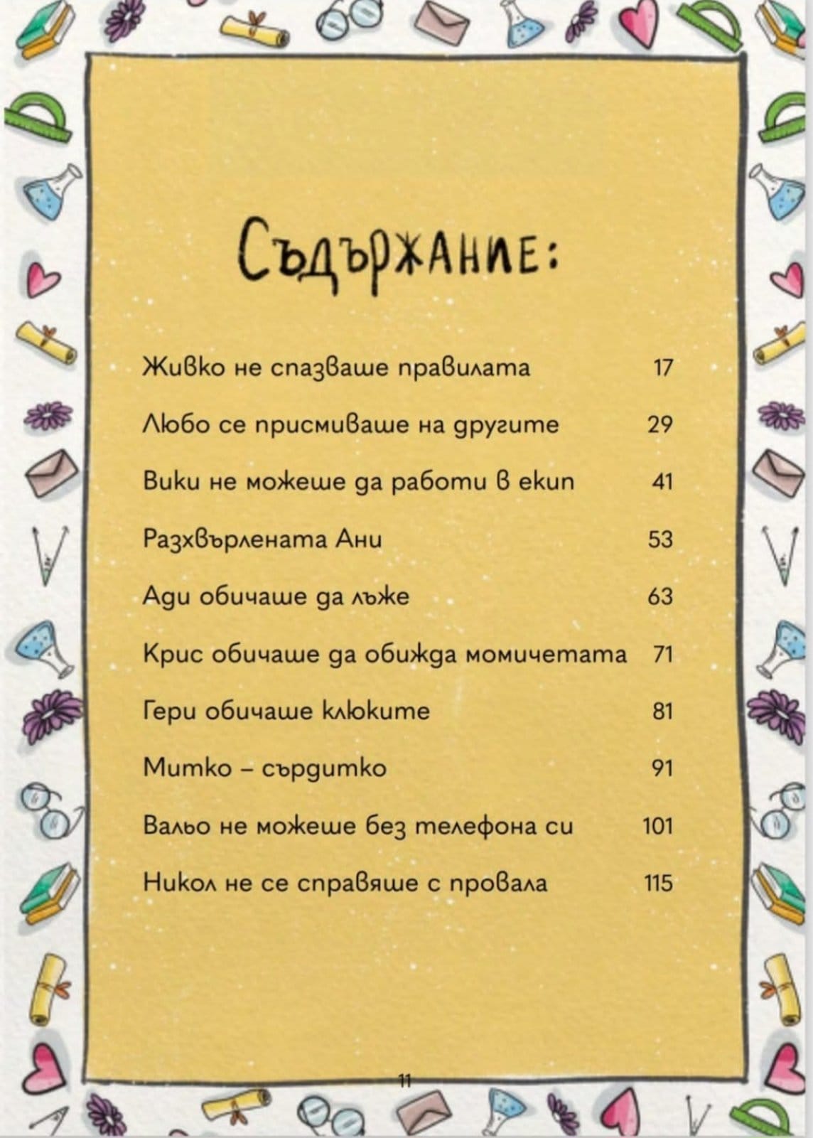 В тази книга ще откриете 10 забавни и поучителни истории от живота в училище, разказани на достъпен и разбираем език от гледната точка на един клас ученици. Малките читатели лесно ще припознаят себе си и свои приятели в различни ситуации и ще намерят правилно решение на всеки проблем.В историите са засегнати трудности, свързани с неспазването на правилата в училище, лоша дисциплина и негативно отношение към съучениците , неумението за работа в екип и други фактори , възпрепятстващи правилното развитие на учениците в начален етап.